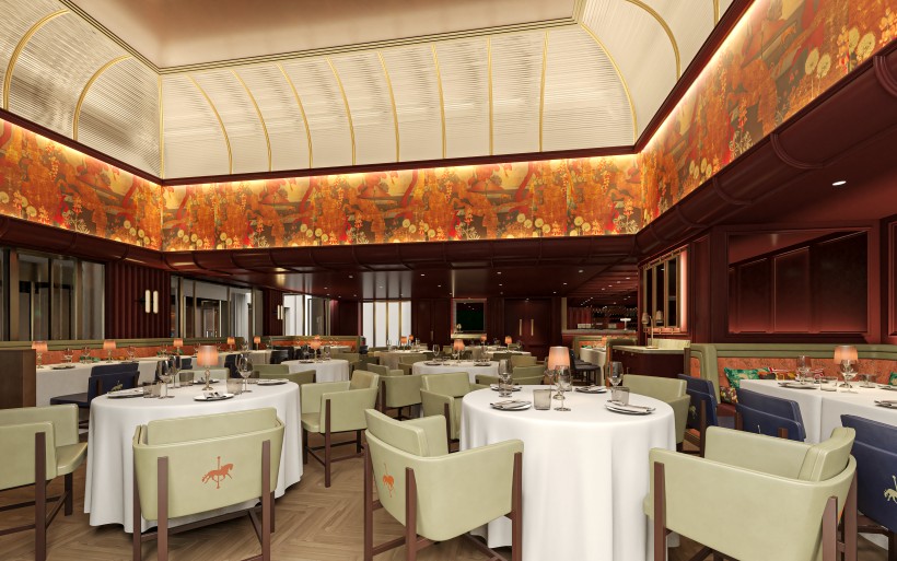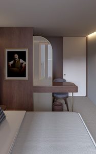 layouts responding to the proportions of each individual space. Interiors pair warm timber finishes with lighter tonal palettes and softly curved upholstery, accented by blue detailing and red velvet curtains. Subtle references to British craftsmanship and tradition appear throughout, set against darker, more atmospheric circulation spaces.