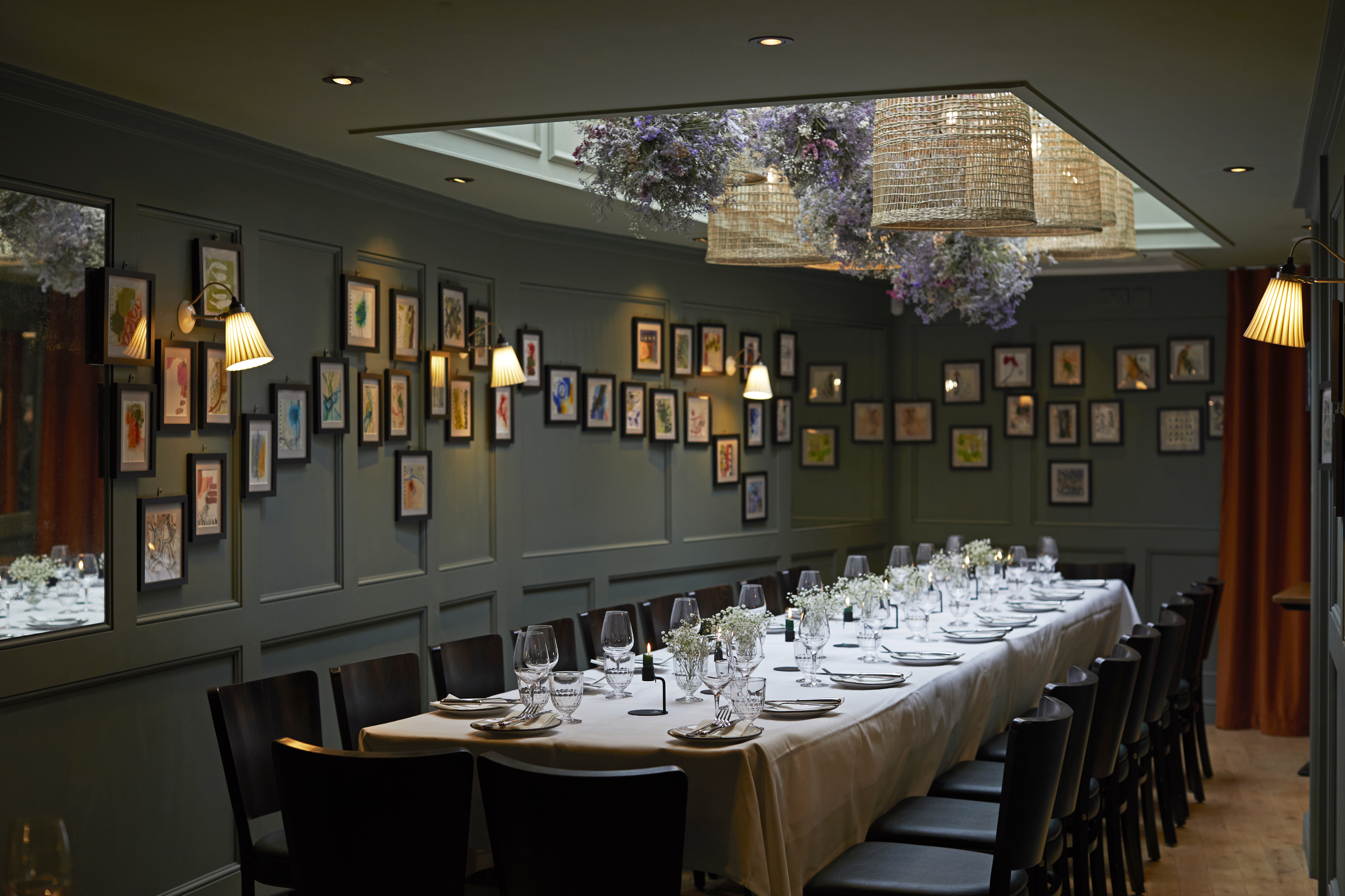 The interior design by Richard Gladwin and Ellie Dichler from Studio ED emulates the rustic feel of its surroundings, incorporating wooden panelling set against green and white striped seating, low hanging wall lights, spotlighting and playful wallpaper picturing scantily clad farmers, to create a relaxed and convivial, yet sophisticated, atmosphere. The artwork ties the space together comprising a combination of colourful rural scenes by Bridget Gladwin, interspersed with abstract pieces from rural artists. For those looking for a more intimate affair, the private dining room seating 22 guests set under a large skylight acts as the perfect backdrop for celebrating a special occasion.