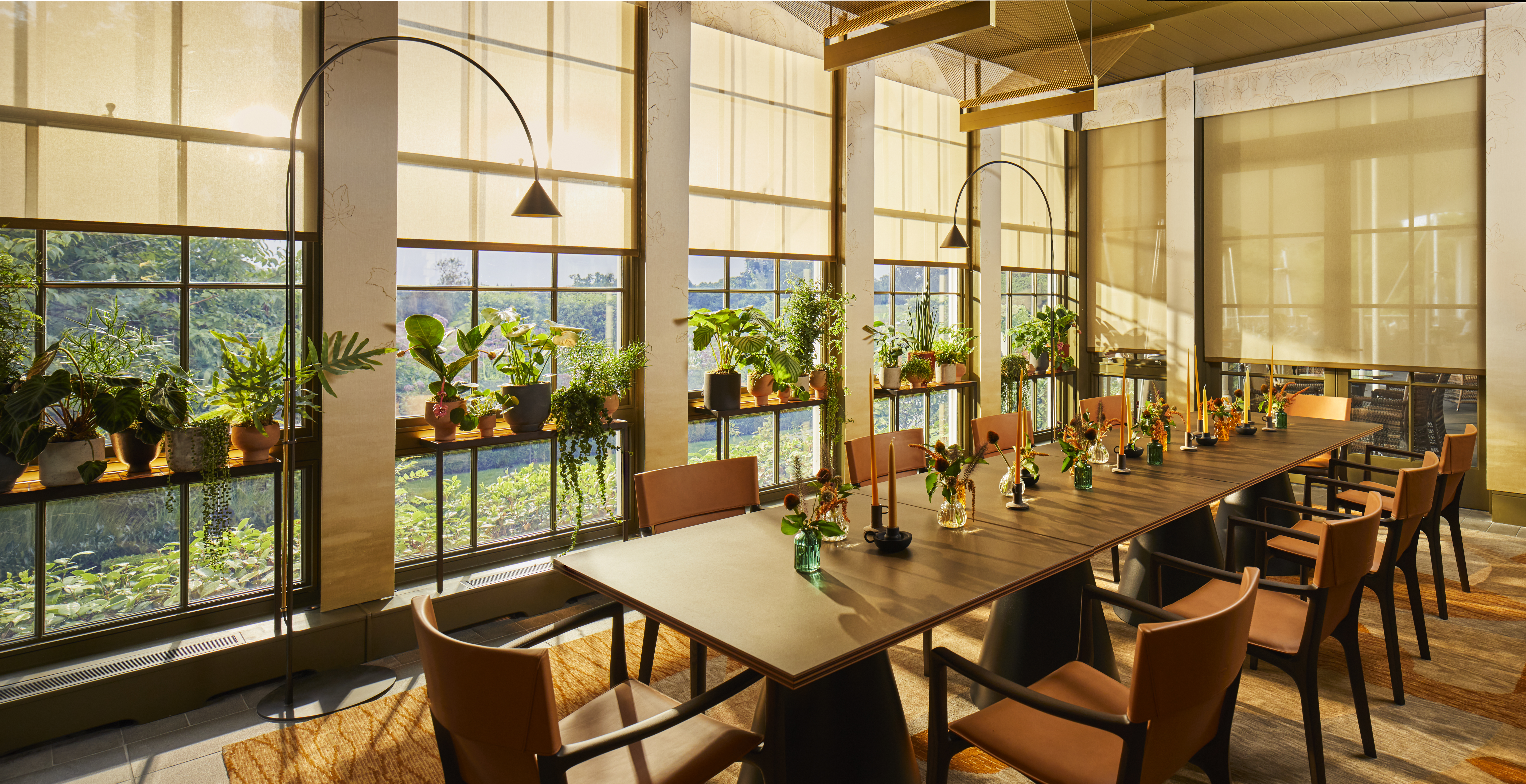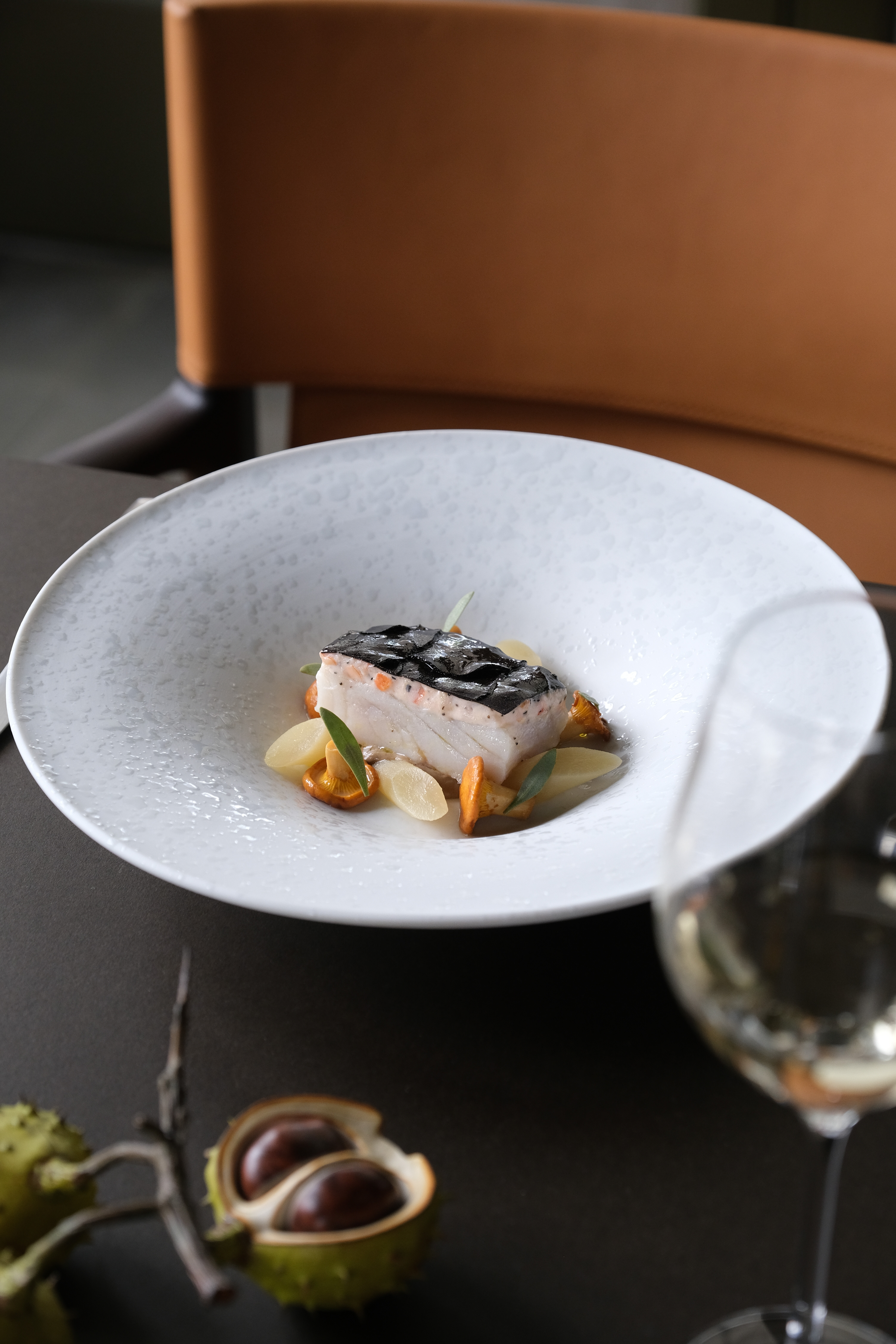 A light-filled conservatory with expansive views over the Berkshire countryside sits to one side of the pantry, offering an extension of the main restaurant space or an exclusive private dining setting for up to 12 guests. The main dining room seats 44, with interiors that champion quality, craft and natural materials at every turn. As a centrepiece of the restaurant, a striking plaster relief set with root vegetables sits on the back wall, made by artisans Locker & Riley. The eye is also drawn to a contemporary light installation that mimics a woodland canopy, with delicate rays of light pouring over the restaurant below. The design of the space sets the scene for a wonderfully storied dining experience.