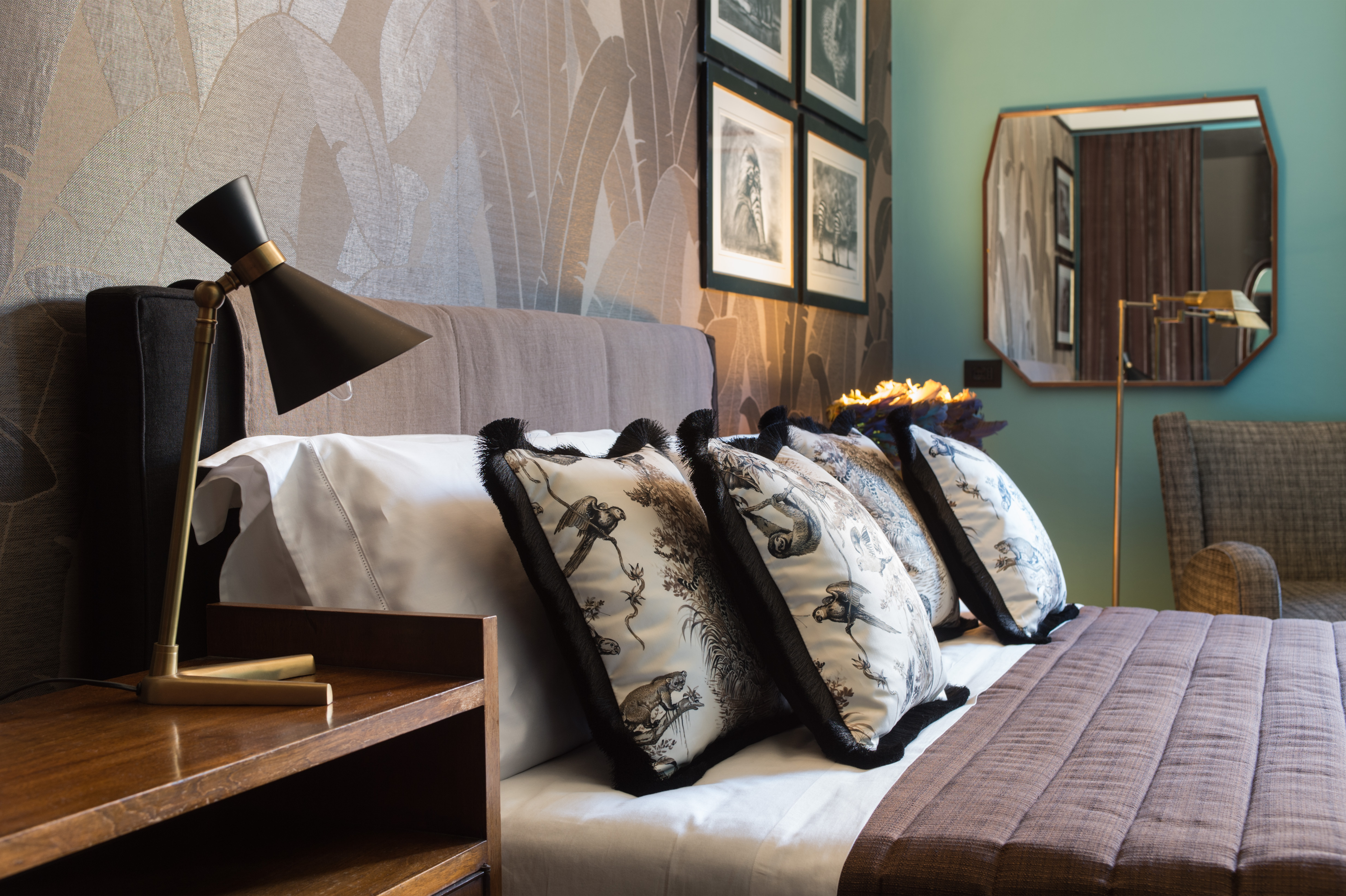 Gong’s Peggy Lights were used in the unique interior design of the Velona’s Jungle Hotel in Florence.  Comprised of four Luxury Suites, each one features an exotic jungle-inspired theme, lovingly created using many elegant objets d’art and furnishings dating from the mid-century which were collected by the family’s patriarch – a respected Florentine art dealer.  Gong’s chic Peggy Floor, Wall and Bedside lights were selected for the hotel and worked perfectly, providing guests with comfortable spaces in which to relax or enjoy reading.  The Peggy Lights are made of beautiful antique brass with a stylish coloured conic shade that complements its brass support.  Classic black was chosen for the Velona’s Jungle Hotel, giving a timeless elegant feel.