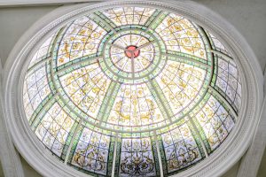 Key features include two spectacular domed stained glass roof-lights within the former banking hall, and an ornate wooden staircase leading to the upper floors, with stone mullion stained glass window over.