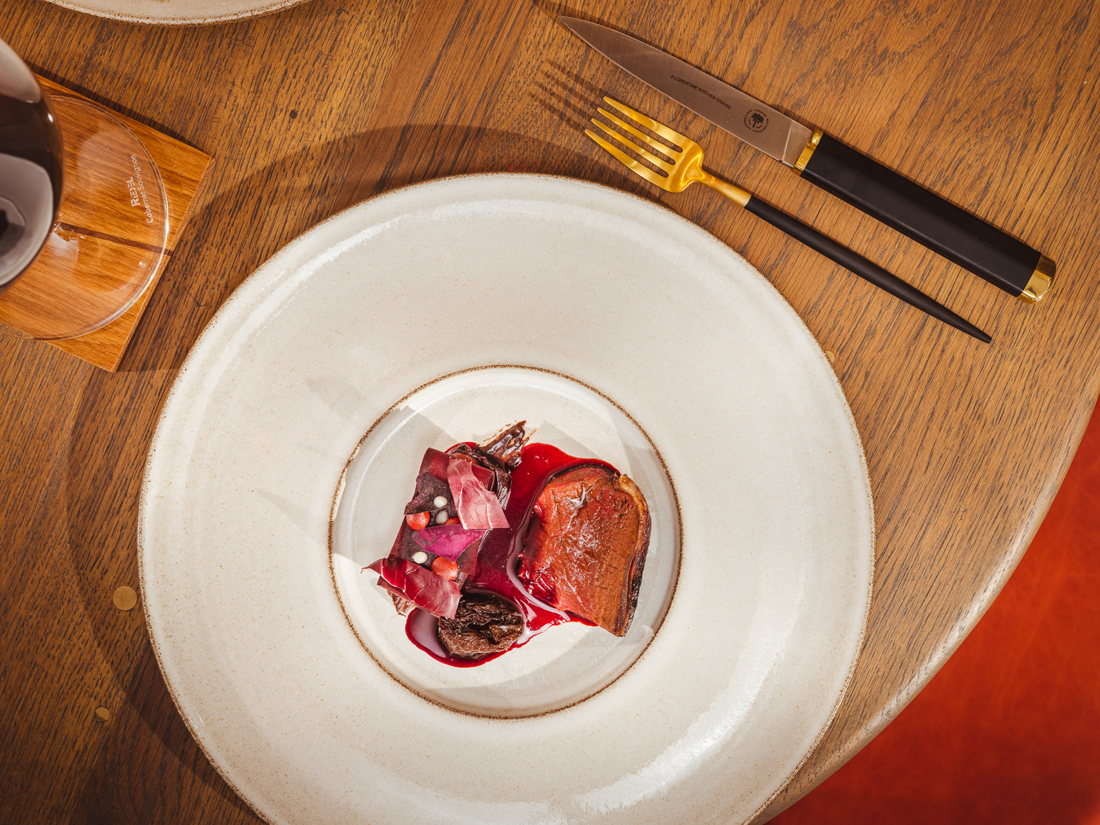 Salt aged Sika deer, crapaudine beetroot, Agen prunes, bone marrow, bitter chocolate