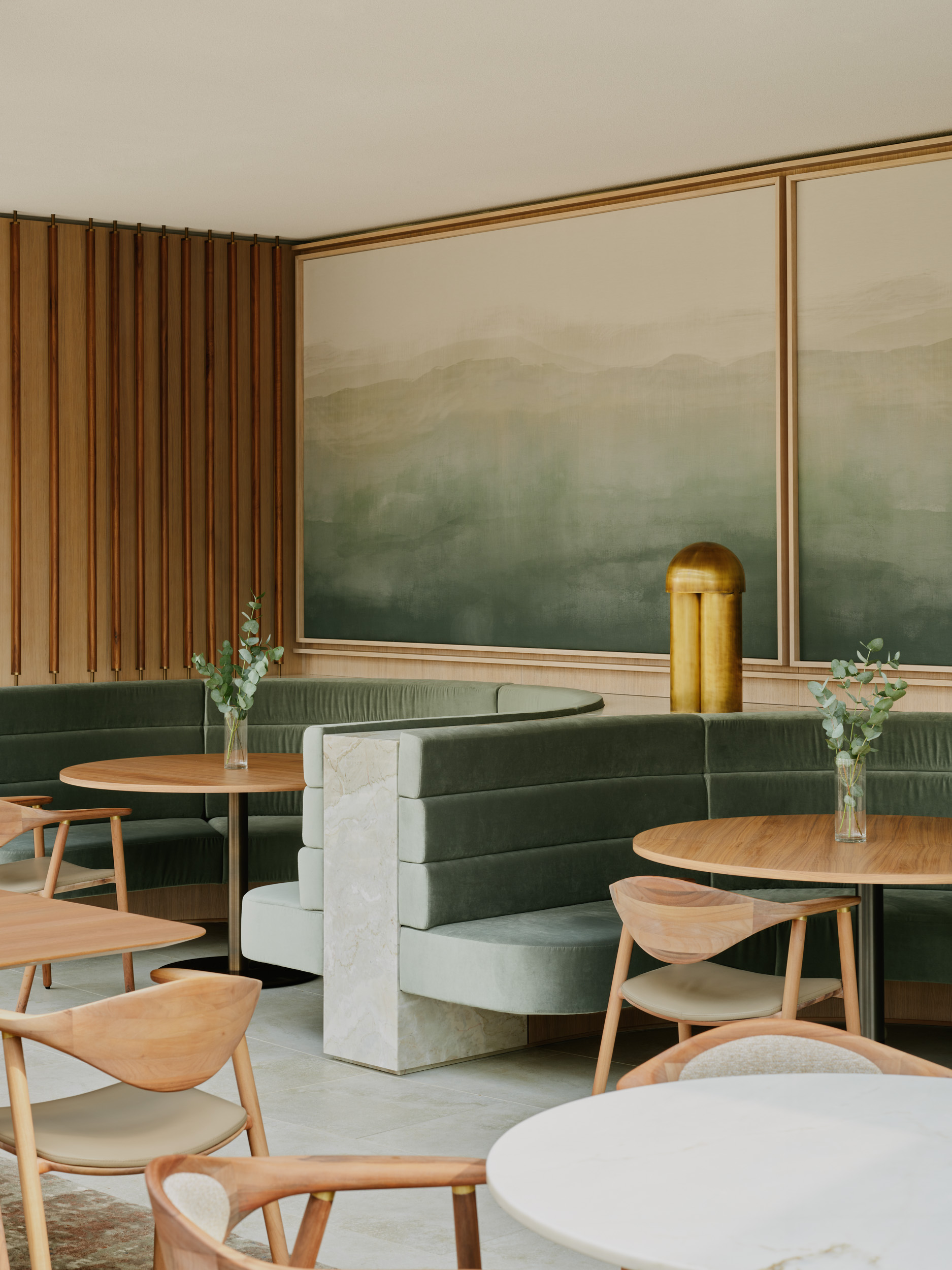 HENN used artisanal touches and hand detailing to create a sense of haptic-luxury. The walls are clad in gray travertine; in the entryway, Bocci Series 73 pendant lights, made of irregularly dimpled glass, create subtle asymmetry and plays of shadow; the entryway and lounge carpets were hand-knotted to HENN’s specifications by Reuber & Henning, a Berlin-based design firm; warm wood panels and hand-troweled plaster work add warmth and tactility; the curving, 16m Walter Knoll rug was hand-knotted from silk, wool and nettle; Paul Matter Monolith Table lamps add a subtle gleam of brass; and the acoustic wall panels are wrapped in a custom-printed textile, made from original watercolor paintings by HENN.