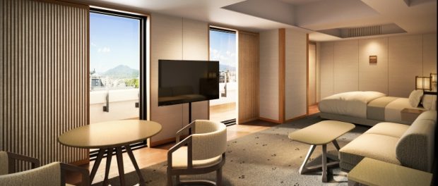 Junior Suites range from 699 to 1,076 square feet and reflect the unique character of their location. Some offer sweeping views of Kyoto’s surrounding mountains, while others provide a close-up of the grand roof of the Gion Kobu Kaburenjo. These rooms harmonize historical ambiance with contemporary comfort, featuring natural stone, soft lighting, and locally inspired art to create a tranquil and memorable retreat.
