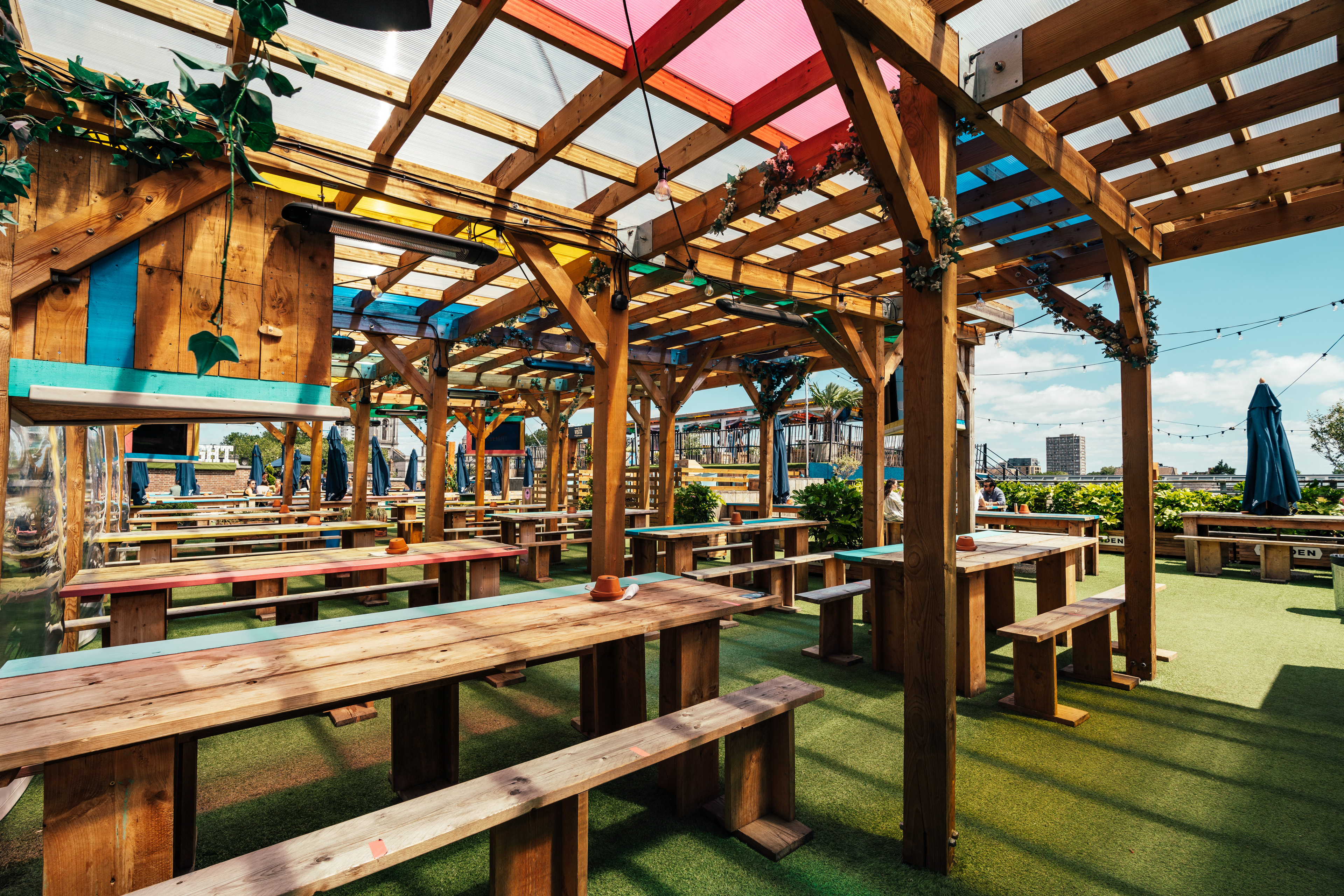 For those looking for outdoor seating in London, Skylight has a wealth of heated tables available. These can be booked by all, including mixed households in groups of up to 6. Tables are available both under the sheltered pergola and outside throughout the venue.