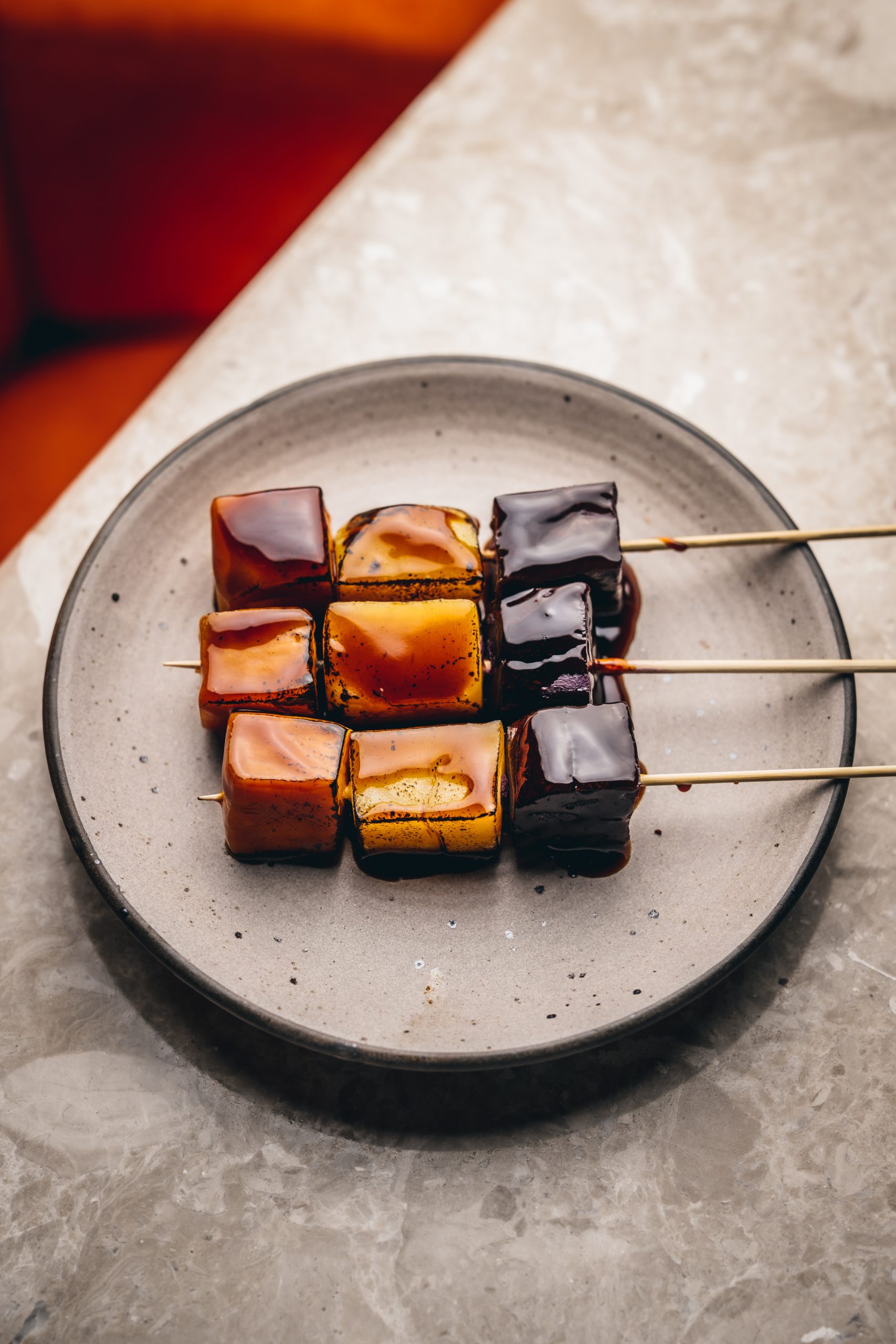 The interiors, designed by Orphic Design Studio, take inspiration from the myriad pan-Asian cultures represented by Gura Gura. The space has a fun and colourful feel with maximalist touches and plenty of foliage on both floors. The upstairs is a smaller space that seats 30 with a sweeping bar at the entrance and a sushi counter where the fresh raw fish dishes are prepared. Head downstairs via the bespoke wine tunnel into the larger bar/dining room furnished with lounge style chairs and tree-like separating columns to give each table a cosier feel.