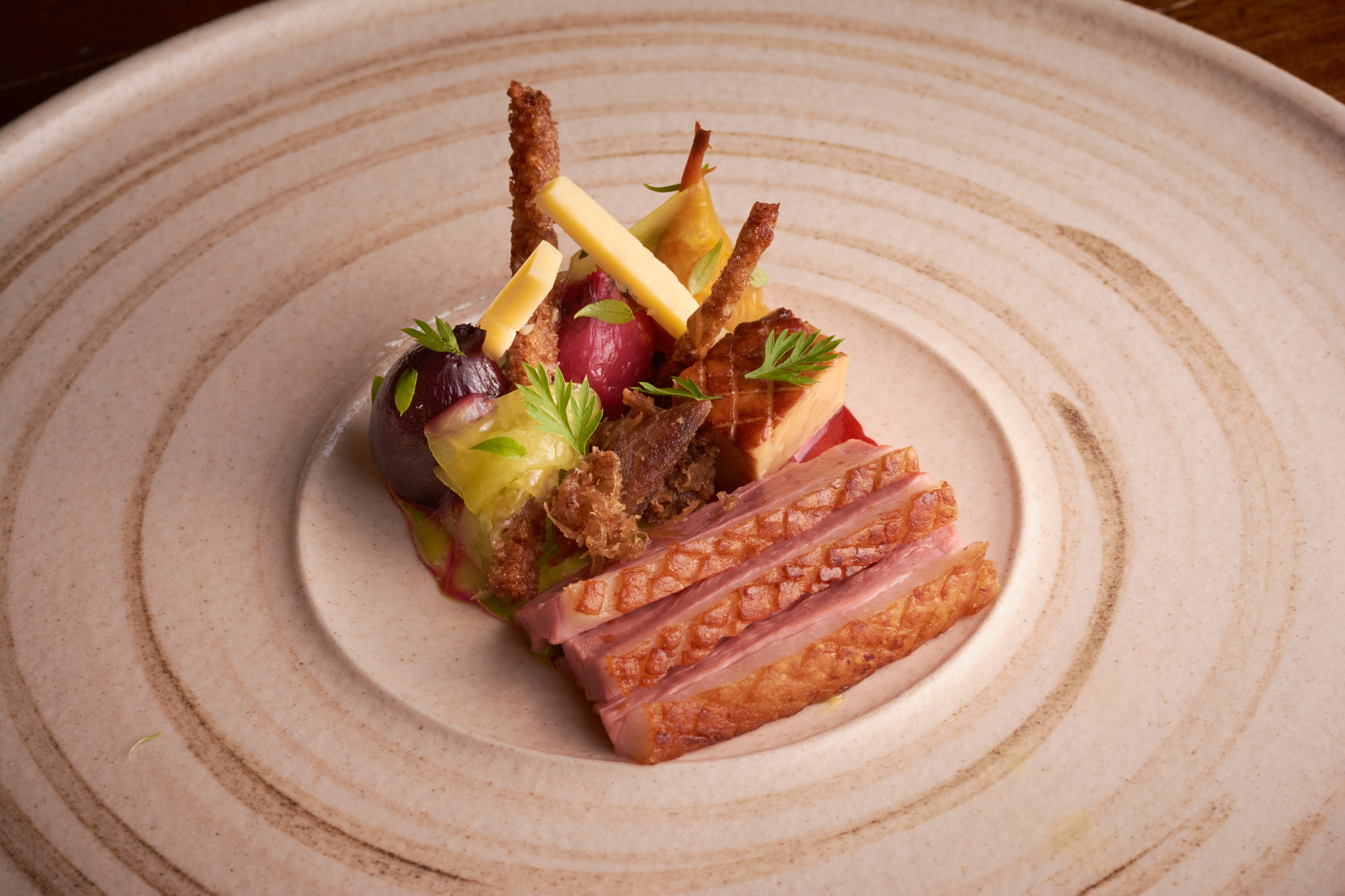 Native lobster, sesame, red pepper, caviar; Roasted John Dory, sardine, bacon, razor clam; Gressingham duck, five spice, carrot, sloe; Lancashire suckling pig, leek, Mrs Kirkham’s, cep; Eshton Herdwick lamb, haslet; and hotpot; and Plum, meringue, bergamot, yoghurt. Snacks are also presented on arrival and an optional cheeseboard featuring local varieties features too.
