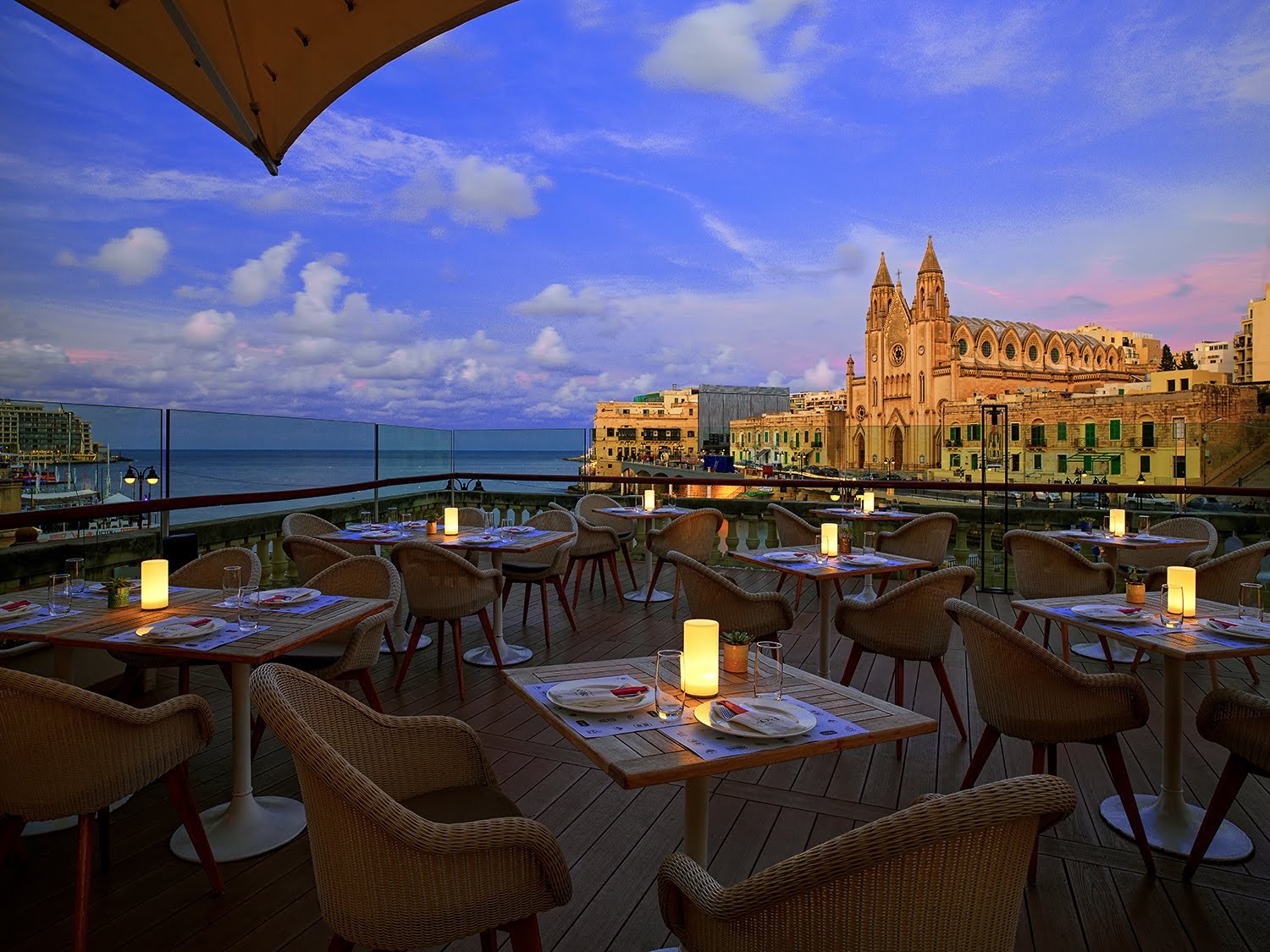 Openings in the sheltered terrace frame the neo-Gothic architecture of the Carmelite Parish Church and Art Nouveau Ballutta Buildings, looking down onto the beach, a seaside promenade that leads to the thriving towns of St Julian’s and Sliema and a buzzing piazza.