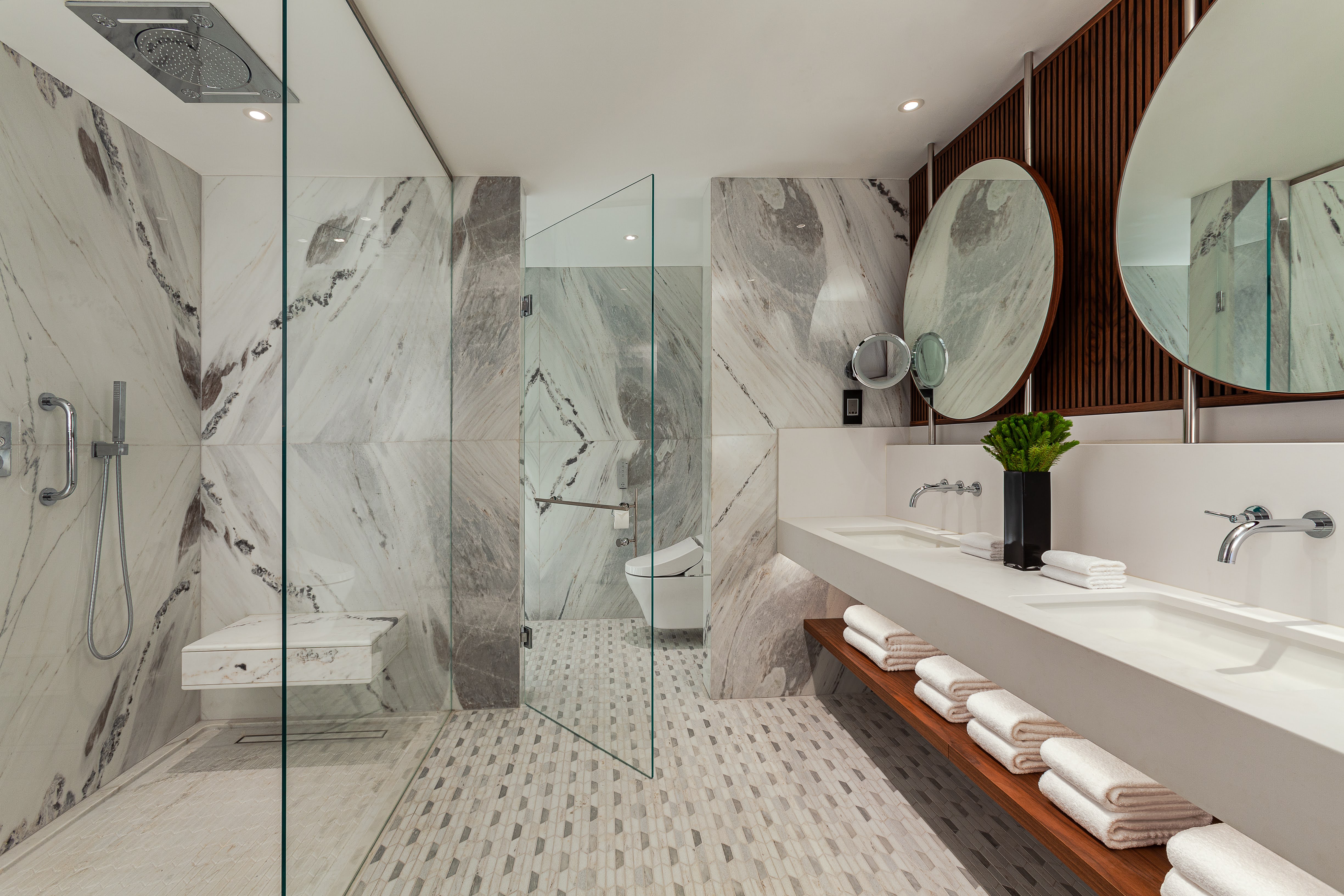 Perched on the 12th floor, panoramic views of picturesque Balluta Bay are visible from the entire 170 sqm suite, with its expansive terrace, balconies and windows running the whole length of the airy Room 1200, flooding it with natural light. The suite’s interiors are the work of RPW Design, responsible for the refurbishment of the whole hotel. Drawing inspiration from the Mediterranean island and Marriott’s immediate surroundings, it encapsulates the warmth of the Maltese stone and the shades of the sea, the soothing sound of which instils a sense of calm in its guests. With ample space for dining and a comfortable lounge area, the closed terrace works as an extension of the interior, allowing the outdoors to be enjoyed year-round, being shaded in the warmer months and an intimate sofa setting in winter.