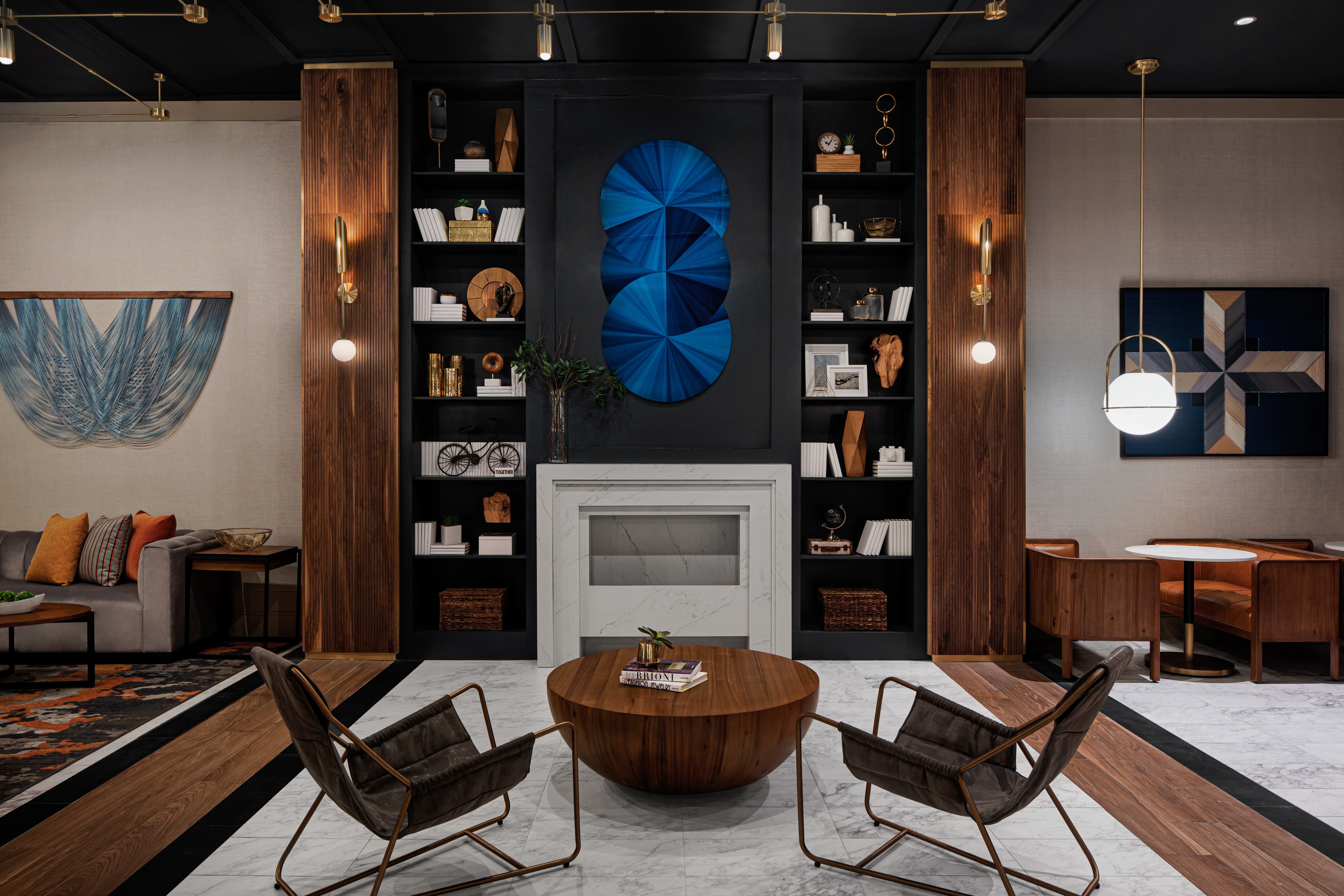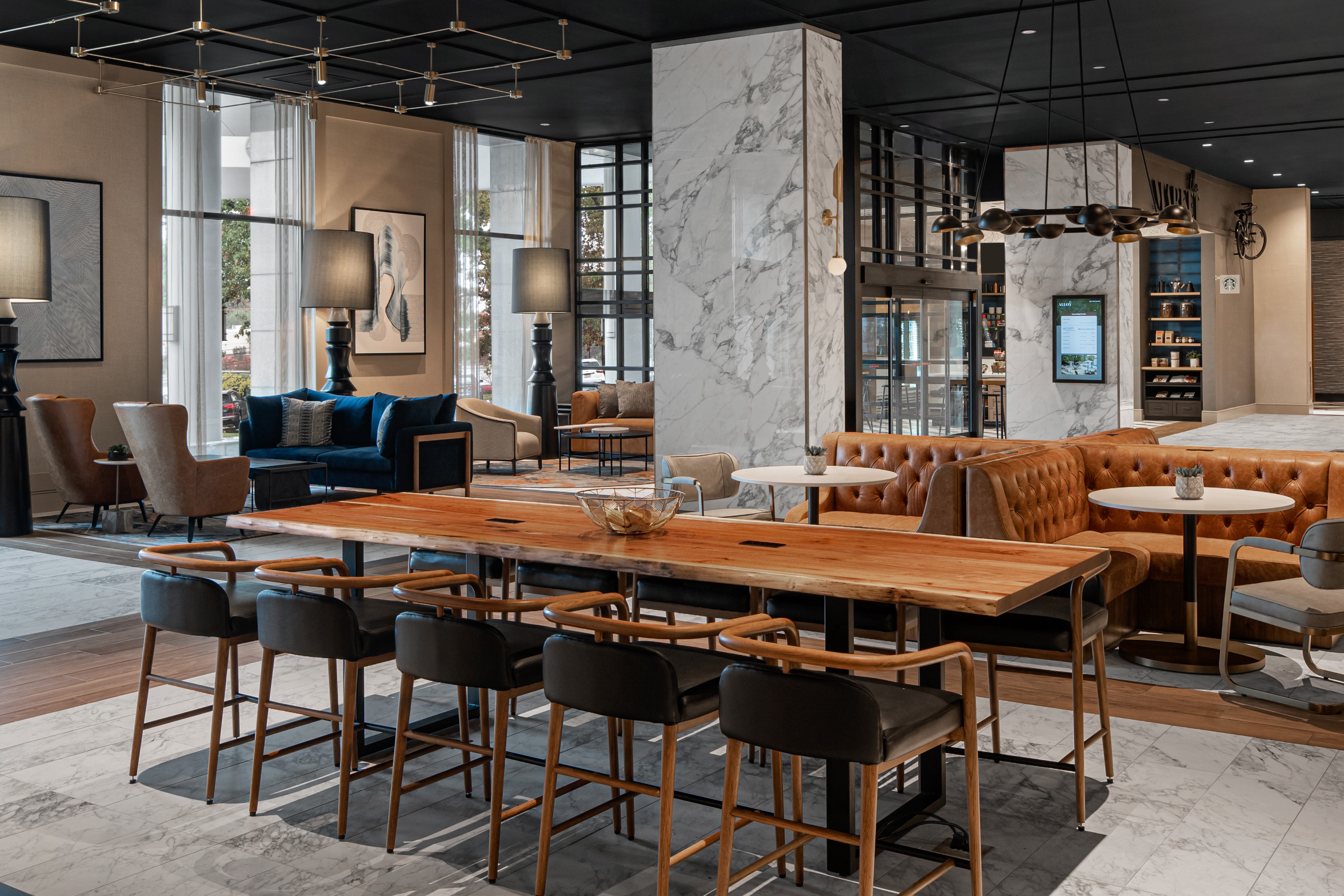 As guests enter the Alloy, they are greeted by a warm, inviting lobby featuring rich wood tones, stylized marble tile, and mixed metals. Nodding to the idea of the crossroads, intricate tile inlays offer guests the choice to veer left and become acquainted with the Philly-inspired market or navigate to their right and experience the lobby bar, Hammer and Fire restaurant, and the expanded fitness center.