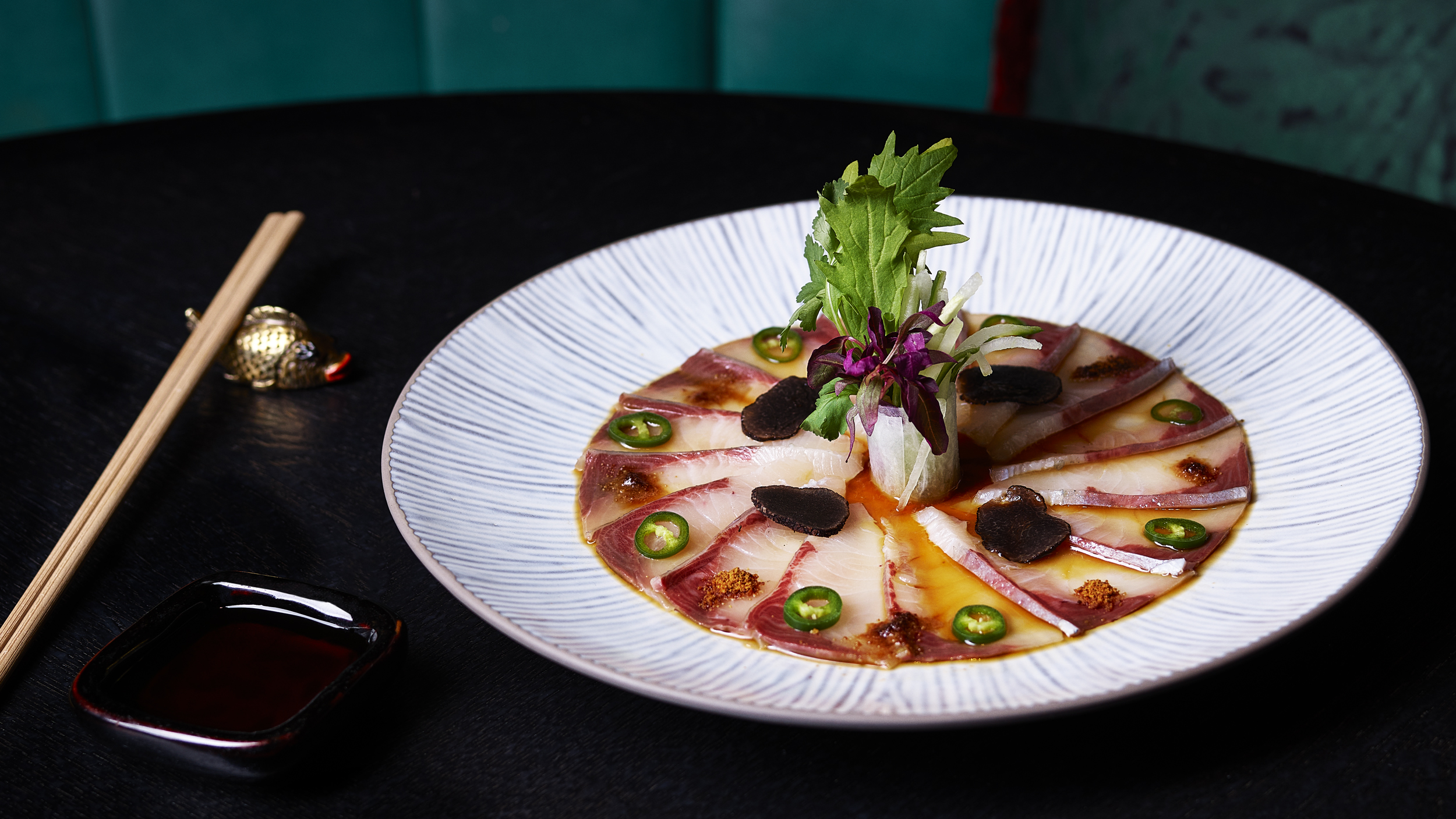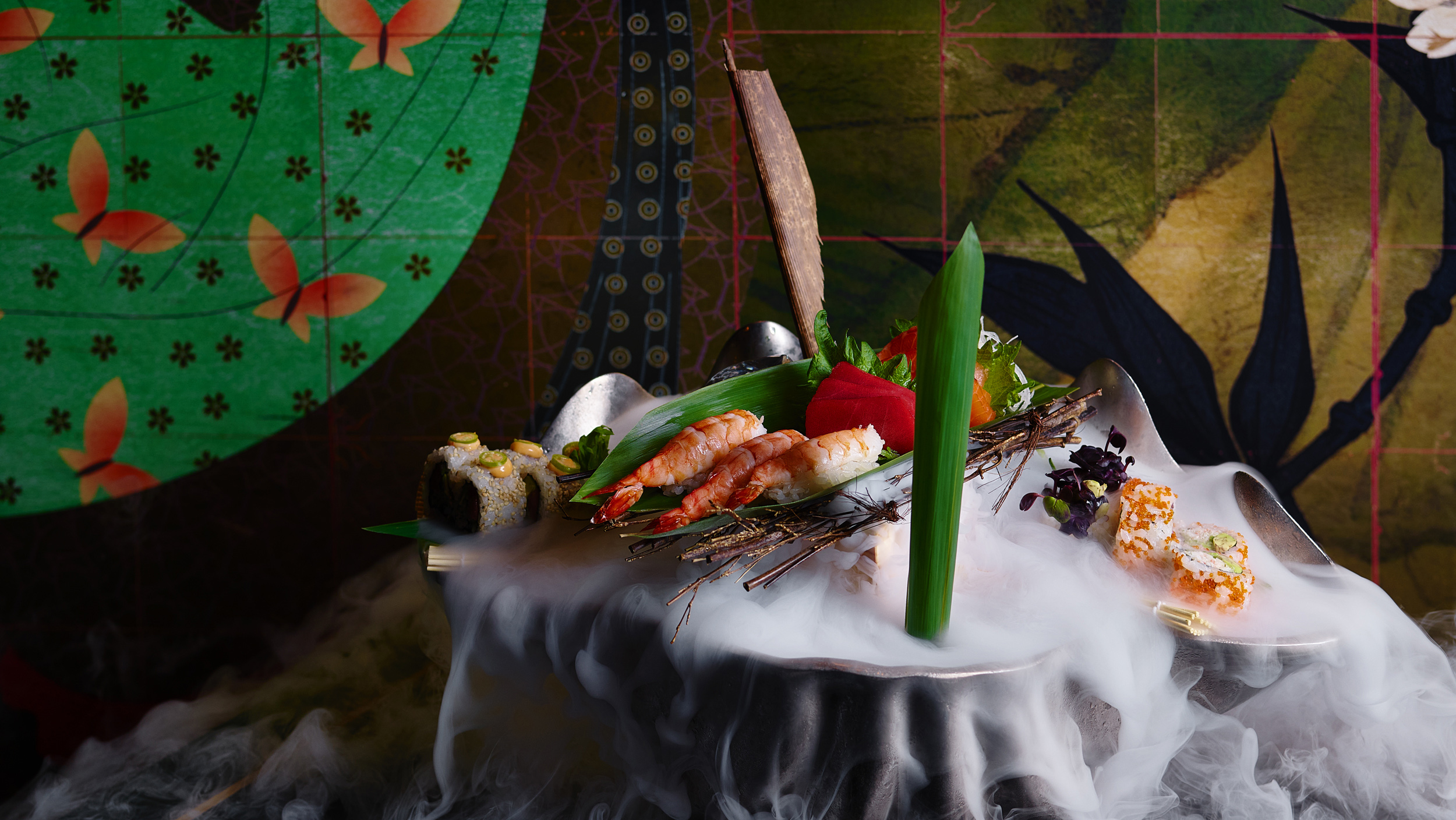 On arrival, diners will be met by the now infamous, luminous green onyx flooring, whilst the restaurant will feature two large cherry blossom trees and bespoke Paul Clifford artwork. Fitted beautifully with striking artwork, luxurious Asian fabrics, colourful wallpapers, and antiques, the space is designed to be elegant yet vibrant. Alongside the main restaurant and bar, guests will also be able to experience mezzanine level seating and a sushi bar, where dishes and delights will be prepared before their very eyes.