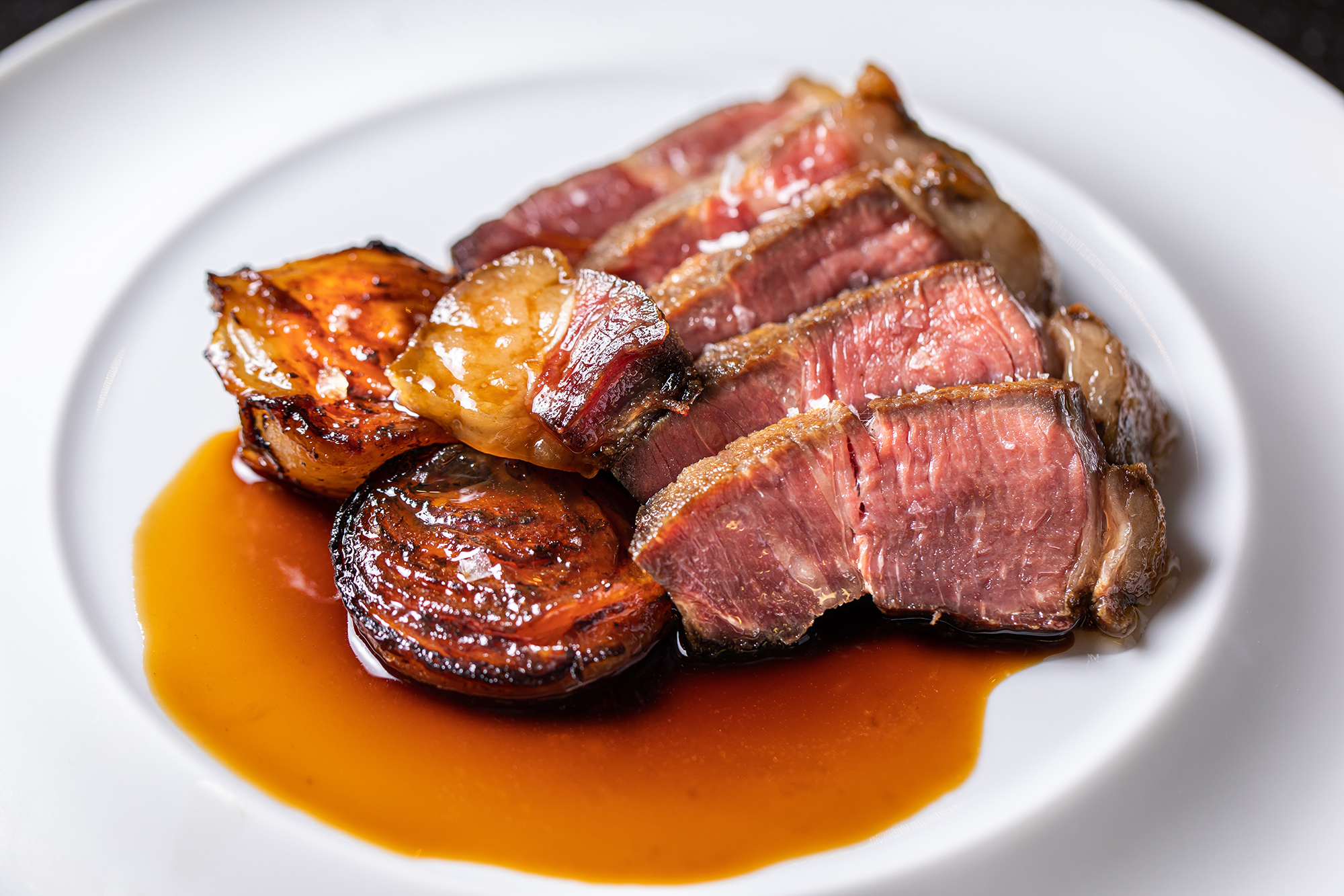 50 day aged Hereford sirloin, beef sauce, caramelised onions cooked in beef fat, thyme oil and salad of little gem lettuce and pickled onions £45 for 2 people