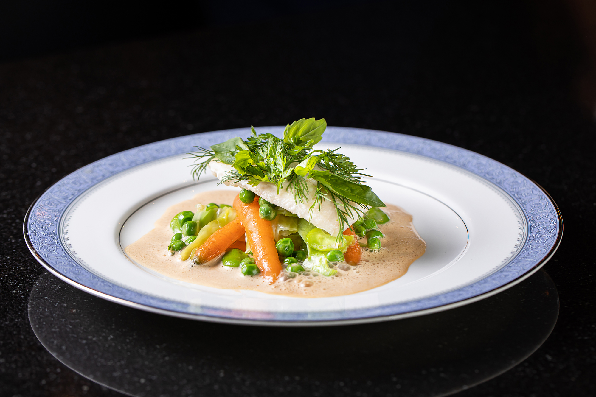 Cornish Day boat fish en papillote, summer baby vegetables, roast shellfish sauce, fine herb salad