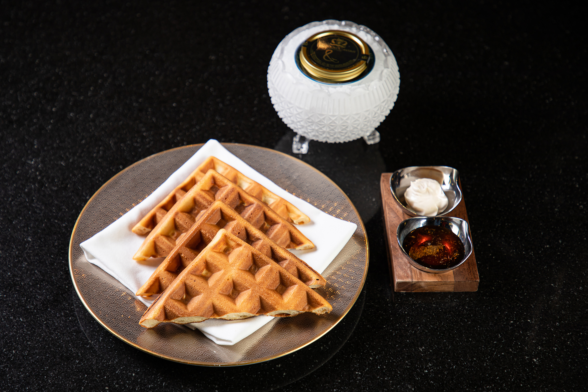 50g Exmoor Caviar, fresh waffles, Creme fraiche & maple syrup infused with white alba truffles £125 for 2 people