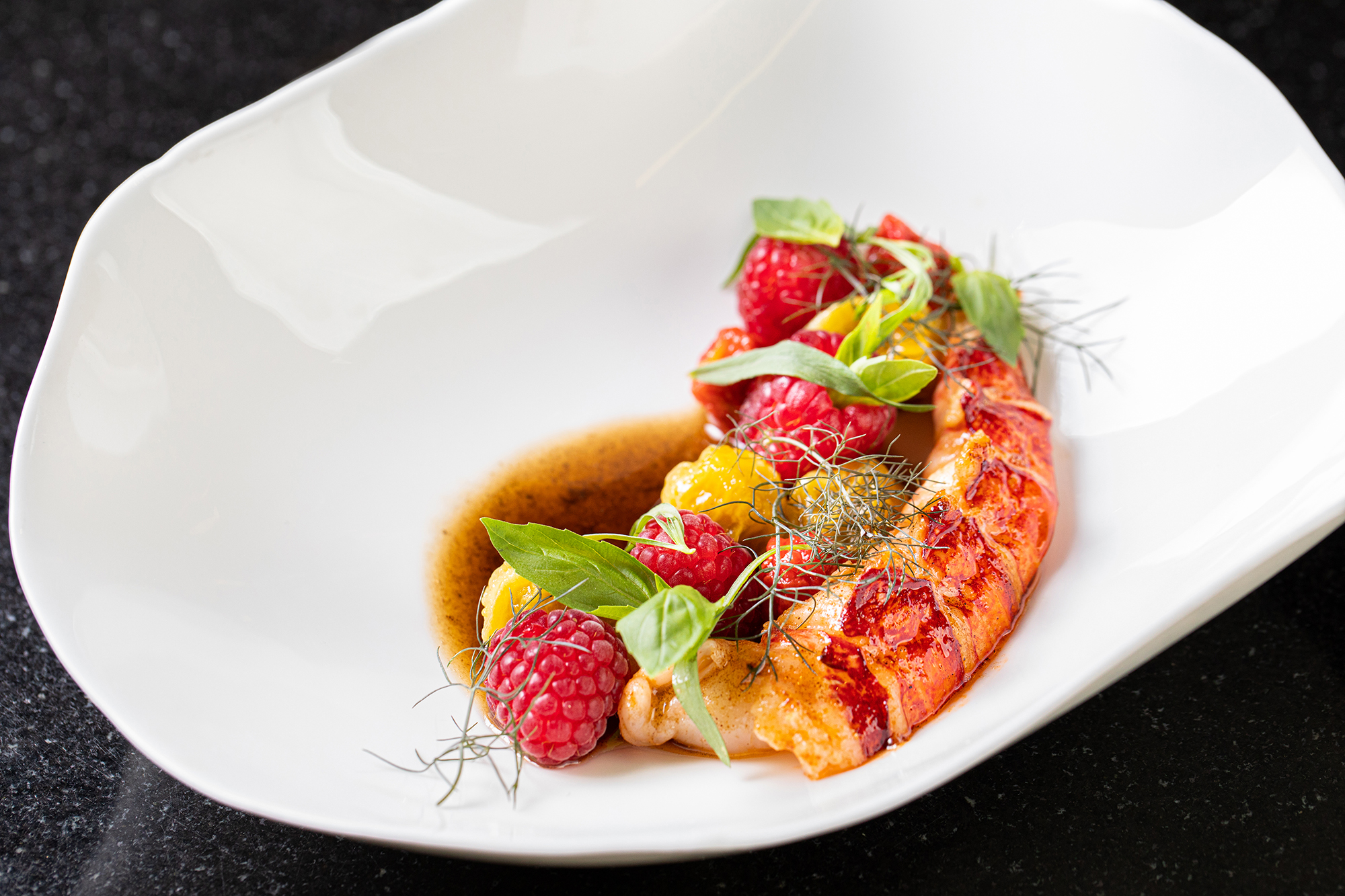 Cornish lobster, Tahitian vanilla infused brown butter, semi dried Isle of Wight tomatoes, English raspberries, and fresh herb salad £25pp