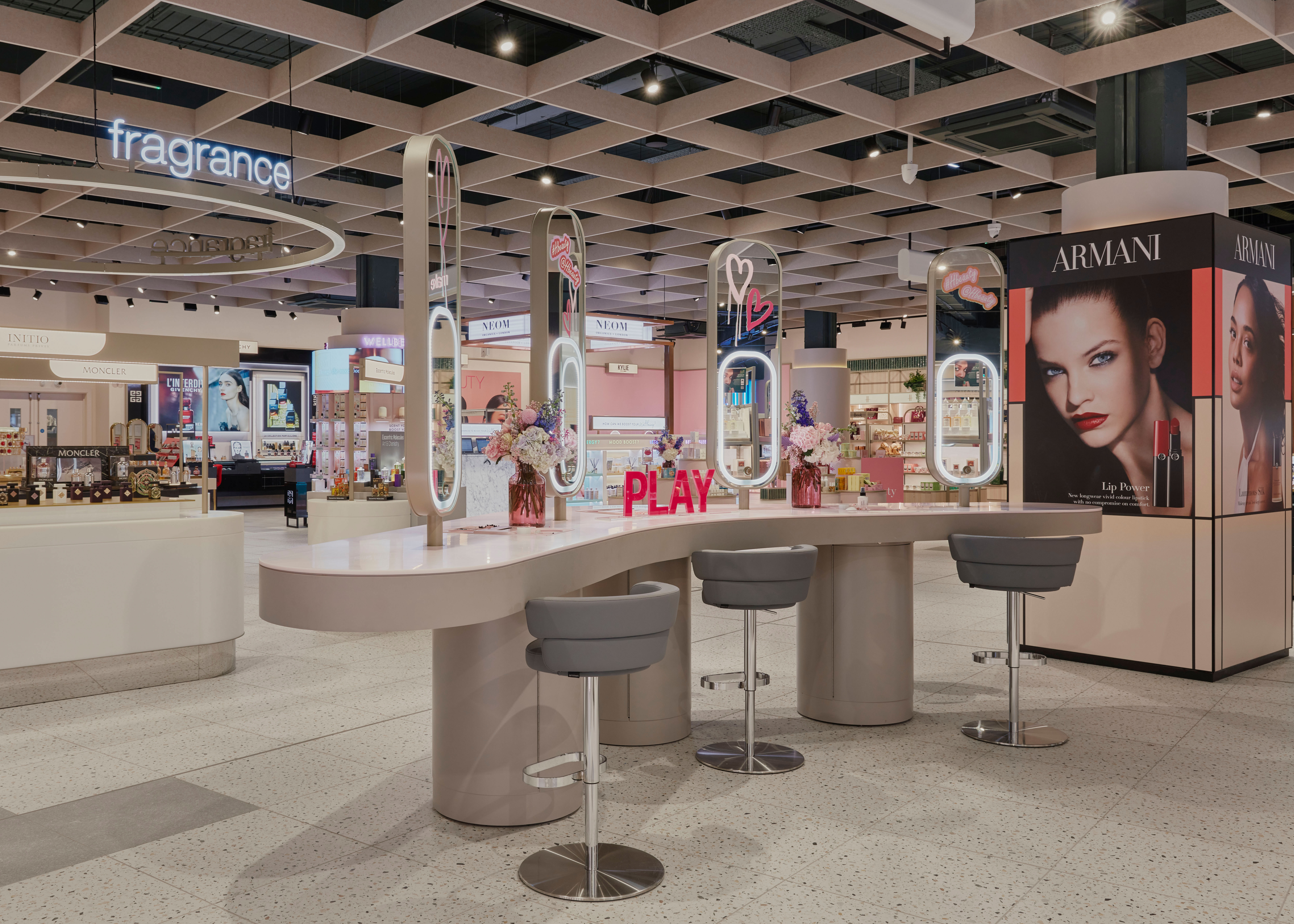 A highlight of any shopping experience is taking a moment to enjoy a coffee or cocktail with friends. With this in mind, Virgile + Partners designed H beauty Champagne Bar. A circular counter with elegant seating and soft lounge seating in an all-day café, serving not only coffee and sweet treats but also a considered menu of speciality cocktails and Harrods Champagne. The cosy space is fully integrated into the store design and adds to the dynamic buzz.